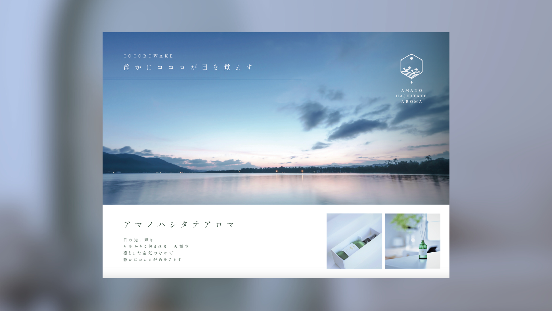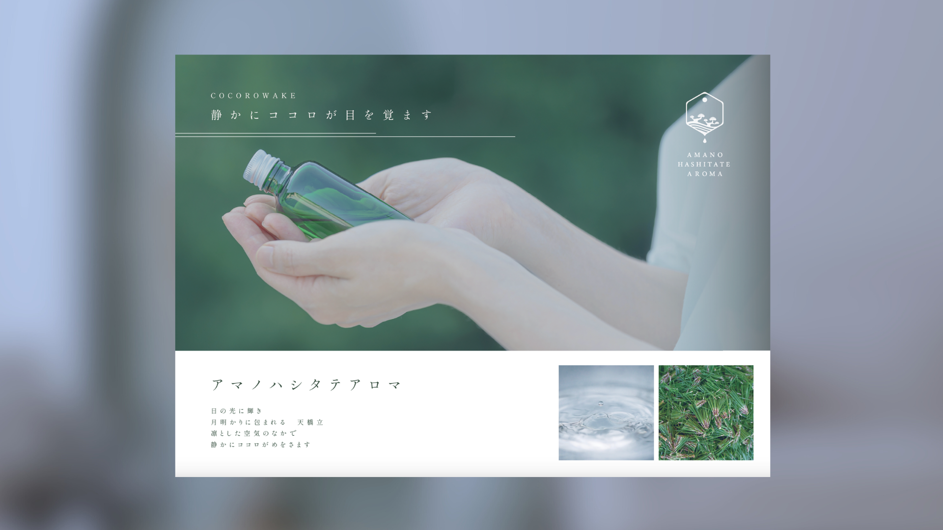 メインビジュアルには、天橋立の情景や、手のひらに香りを受け取る所作を切り取った写真を使用しています。強い情報や説明を前に出すのではなく、「静かにココロが目を覚ます」というメッセージが、視線と呼吸を自然にゆるめる構成にしました。イベント会場のざわめきの中でも、ふっと足を止めたくなる余白をつくることを意図しています。