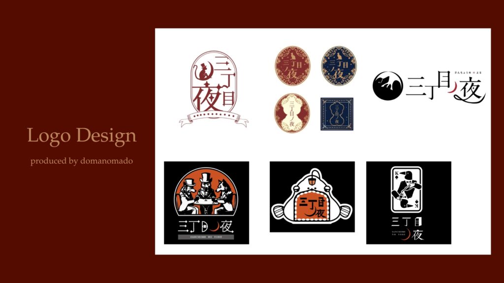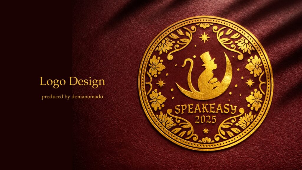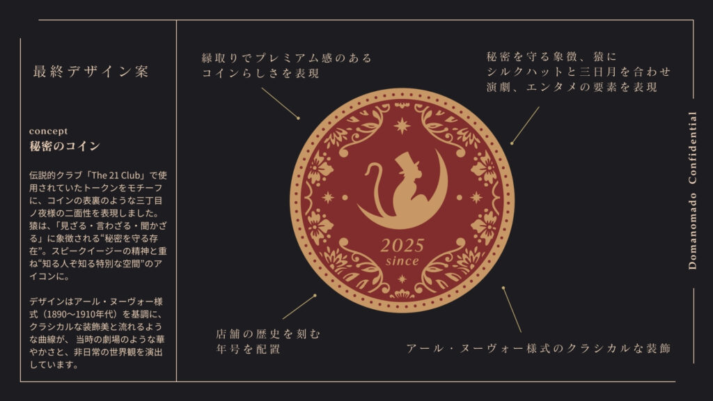 最終的に選ばれたロゴでは、猿をモチーフにしたデザインを採用しました。猿は「見ざる・聞かざる・言わざる」という言葉でも知られており、そこから着想を得て秘密を守る象徴的な存在としてロゴに取り入れています。さらに猿には三日月、シルクハット、パイプを組み合わせ、ミステリアスでクラシックな雰囲気を表現しました。三日月はブラッドムーンの世界観を象徴し、シルクハットとパイプはかつての社交場や舞台文化を表しています。ロゴの装飾には1920年代のアール・ヌーヴォー様式の装飾表現を取り入れ、クラシックな雰囲気と非日常の空気感を演出しました。知る人ぞ知る場所という世界観を視覚的に表現したロゴになっています。