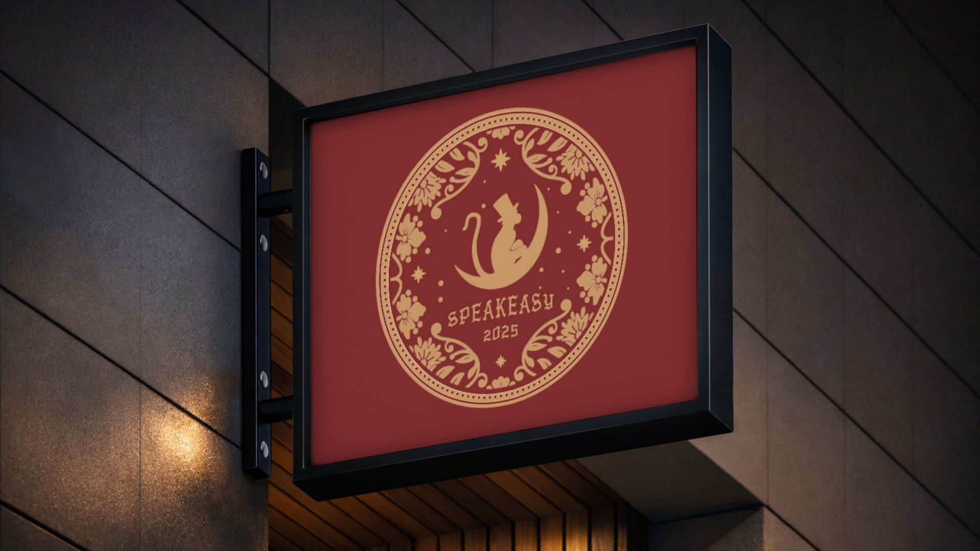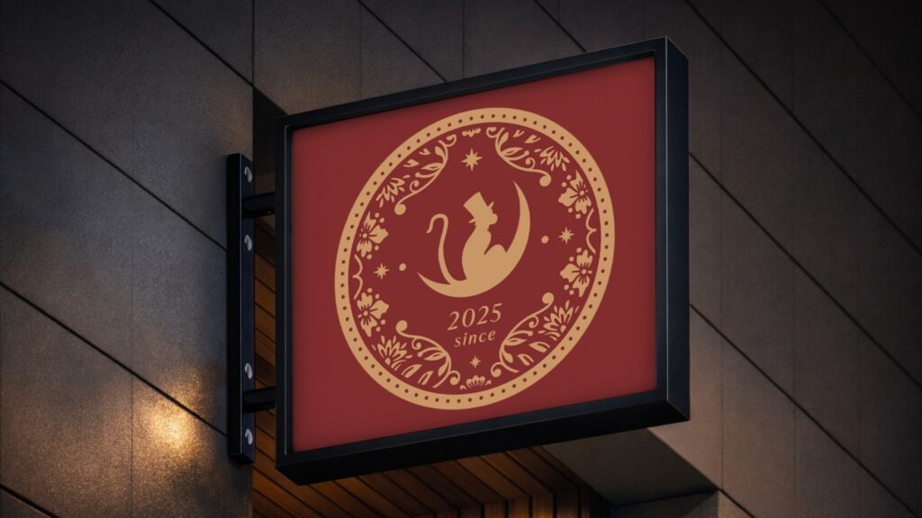 最終的に選ばれたロゴでは、猿をモチーフにしたデザインを採用しました。猿は「見ざる・聞かざる・言わざる」という言葉でも知られており、そこから着想を得て秘密を守る象徴的な存在としてロゴに取り入れています。さらに猿には三日月、シルクハット、パイプを組み合わせ、ミステリアスでクラシックな雰囲気を表現しました。三日月はブラッドムーンの世界観を象徴し、シルクハットとパイプはかつての社交場や舞台文化を表しています。ロゴの装飾には1920年代のアール・ヌーヴォー様式の装飾表現を取り入れ、クラシックな雰囲気と非日常の空気感を演出しました。知る人ぞ知る場所という世界観を視覚的に表現したロゴになっています。