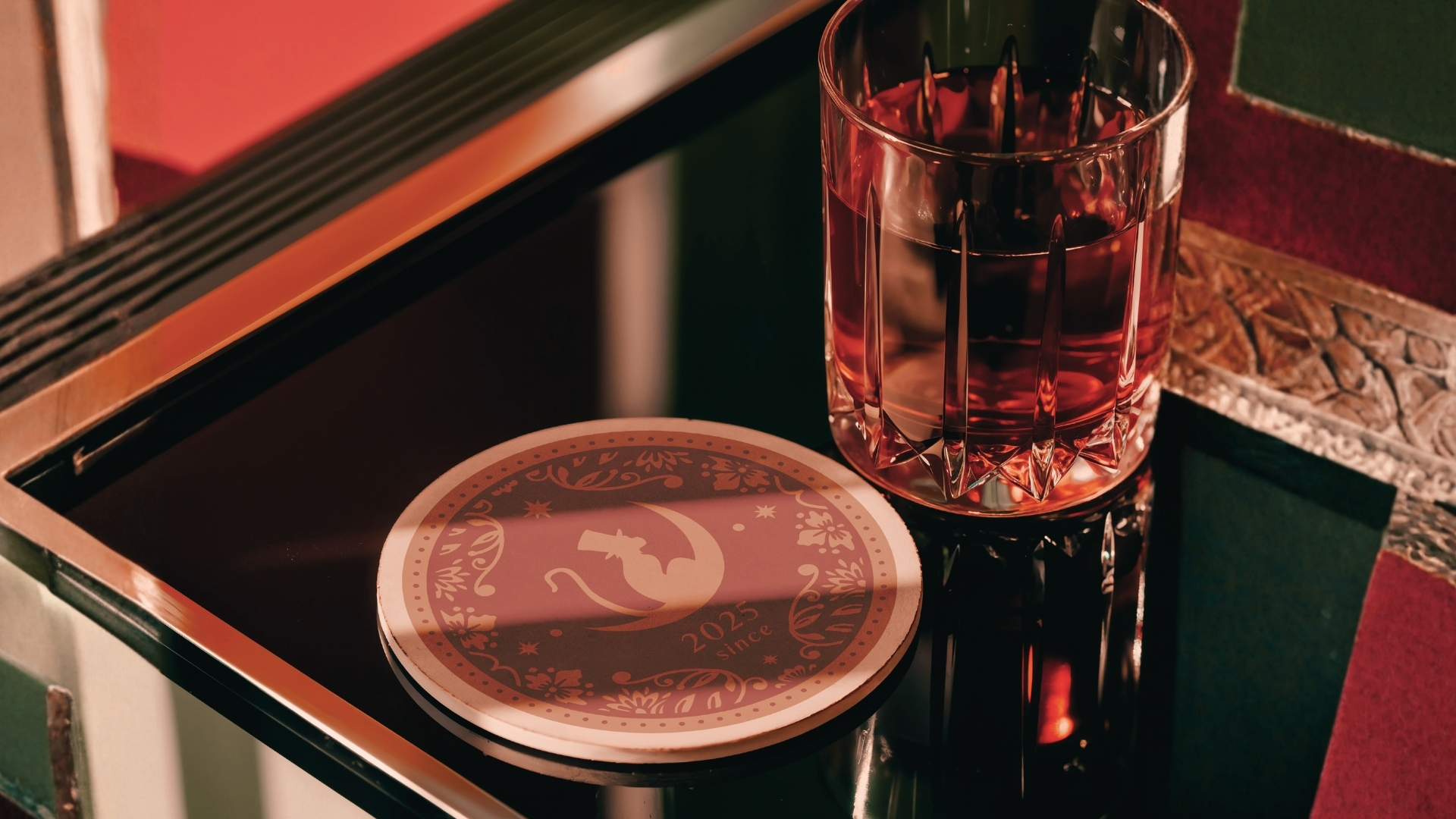 ブランディングではまず、バーの世界観を方向付けるために複数のコンセプト案を提案しました。その中から選ばれたのが「ブラッドムーン」というコンセプトです。ブラッドムーンとは、月が赤銅色に輝く天体現象のこと。夜空に浮かぶその姿は、日常とは少し違う特別な時間の訪れを感じさせます。ブラッドムーンには、新たな始まり、人間関係の真実、創造性の爆発などの意味があるとも言われています。地球から発せられた赤い光だけが大気を突き抜け、まっすぐ月へ届くことで幻想的な天体ショーが生まれる。その光は、エンターテインメントに魅せられた人々の心にもまっすぐ届くのかもしれません。このバーが人と人の縁を照らし、新しい物語が生まれる場所になるようにという想いを込めて、この世界観がブランドの核となりました。