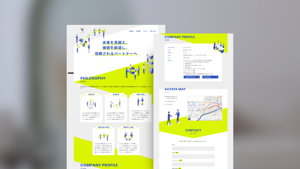 株式会社W VISION様のコーポレートサイト制作を担当しました。企業の事業内容や理念をわかりやすく伝えるとともに、会社としての信頼感やブランドイメージをしっかりと表現できるサイト設計を行いました。コーポレートサイトは、企業の顔となる重要なツール。訪れた方が事業内容を理解し、企業の価値やビジョンを感じられるサイトを目指しました。