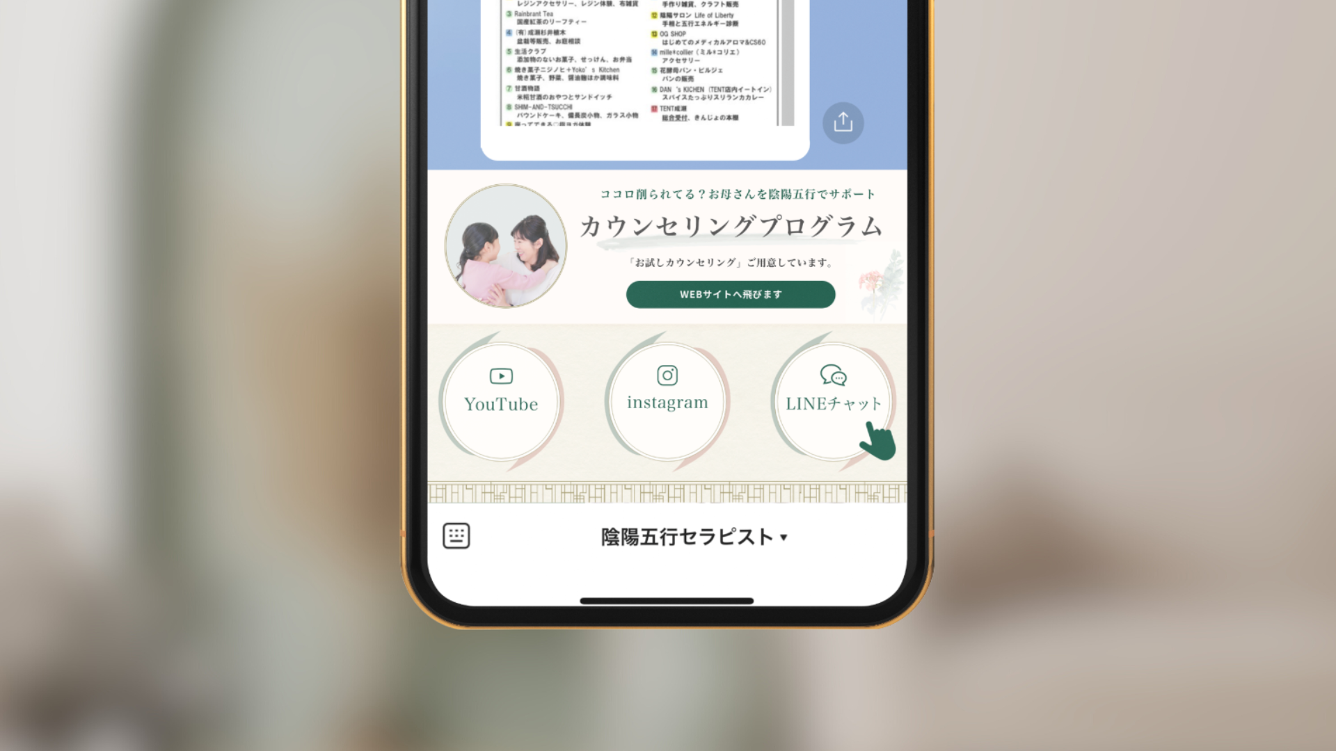 リッチメニューには、カウンセリング、Instagram、YouTube、LINEチャットなど、利用者が今知りたい・話したい場所へ直感的に進める導線を配置しました。陰陽五行や心のバランスを扱うサロンだからこそ、強く誘導するのではなく、「気になるところから触れてみる」余白を大切にしています。デザインも円や和のモチーフを取り入れ、感覚的に安心できる構成にまとめました。