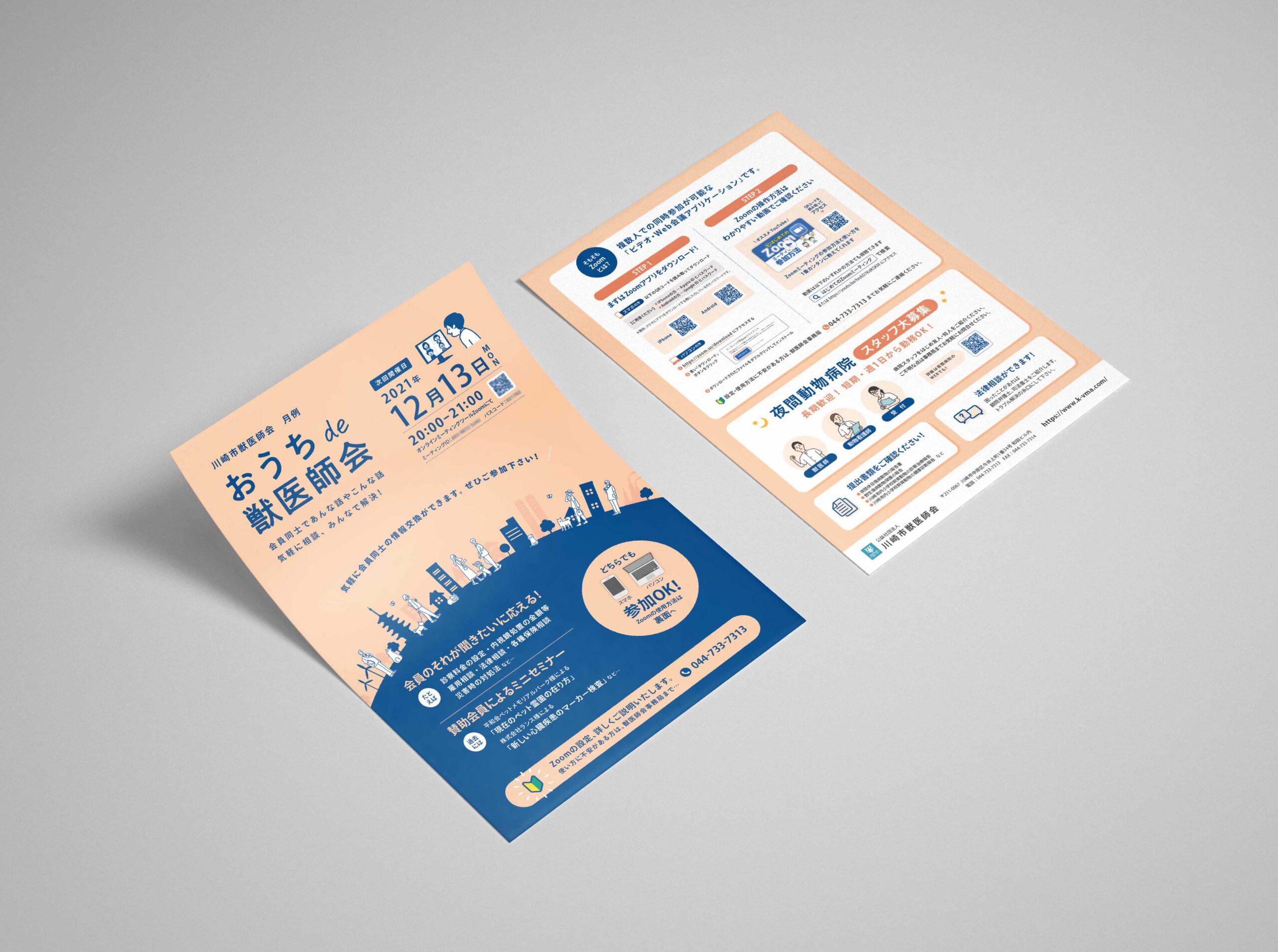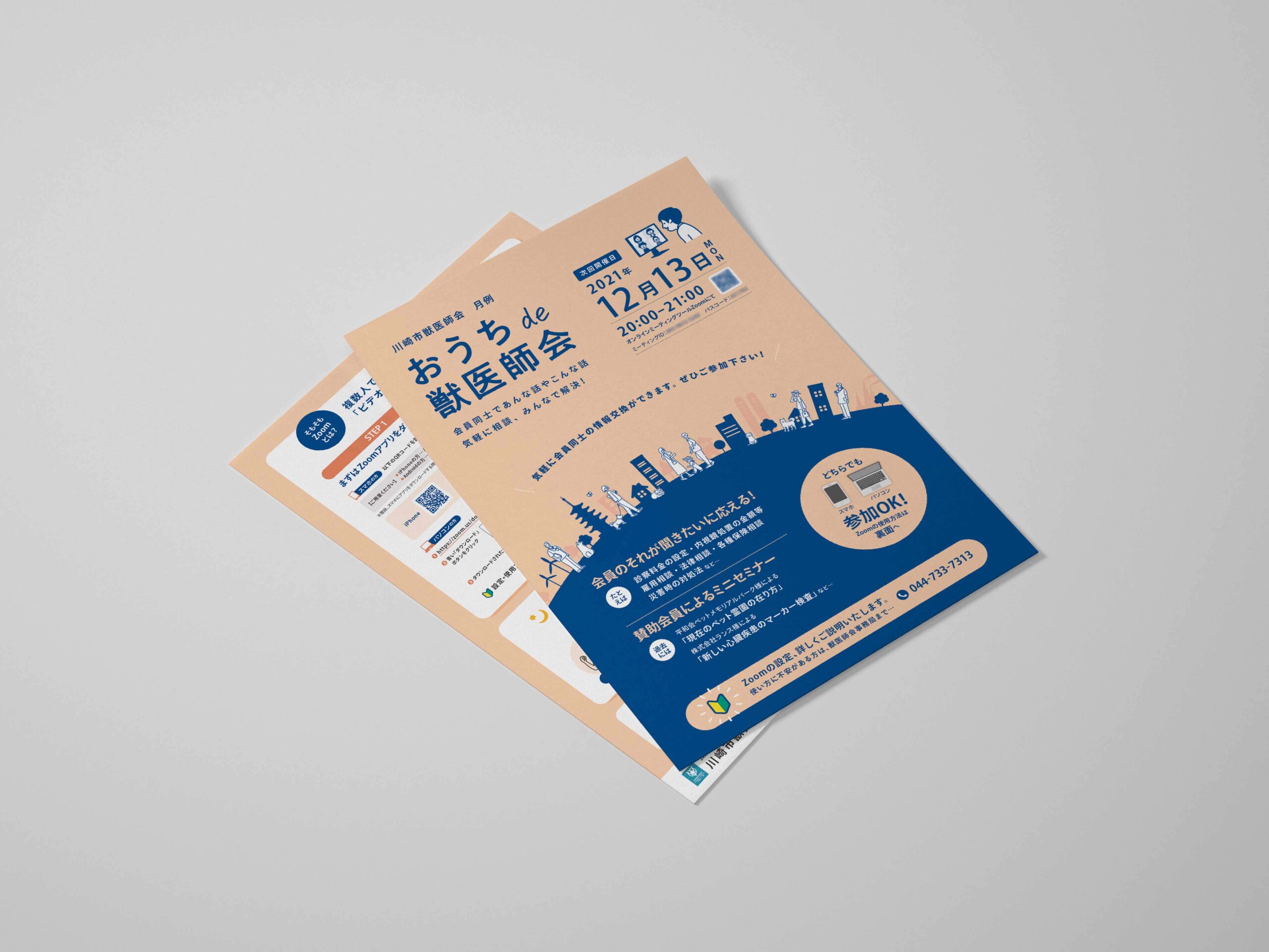 川崎市獣医師会様が主催する、会員向けオンライン定例会のチラシ制作を担当しました。対面での集まりが難しい状況の中でも、会員同士のつながりや情報共有を継続するために行われている取り組みです。今回は、オンライン開催ならではの参加しやすさと、定例会の価値がきちんと伝わるチラシを制作しました。
