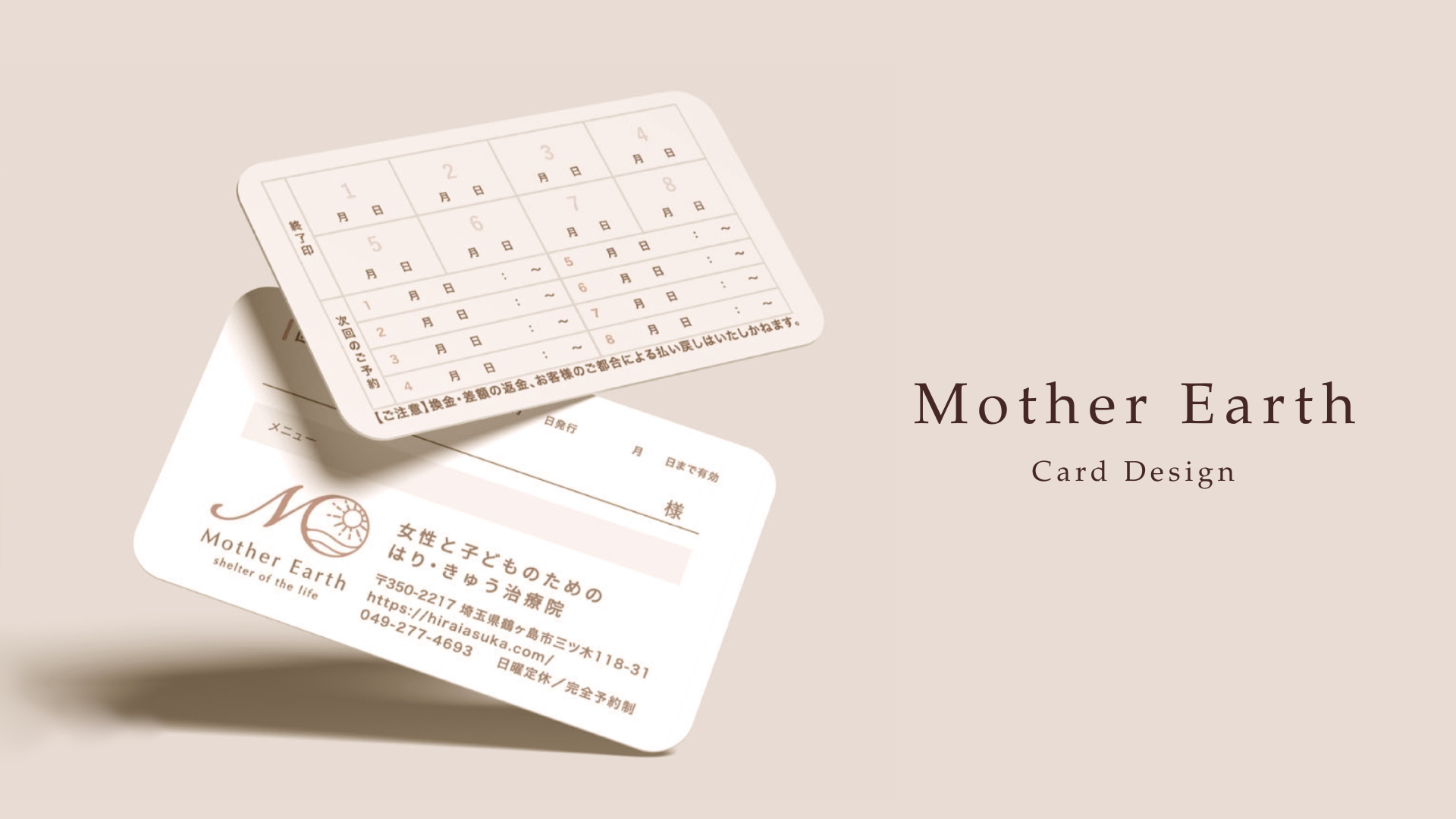 Mother Earthさんでは、ロゴ・看板・空間・カードまで、すべてが同じ思想でつながるようデザインしています。回数券カードもその一部として、「通う場所」ではなく「戻ってきたくなる場所」であることを、さりげなく伝える役割を担っています。小さなツールだからこそ、ブランドの想いが静かに積み重なっていくことを意識しました。