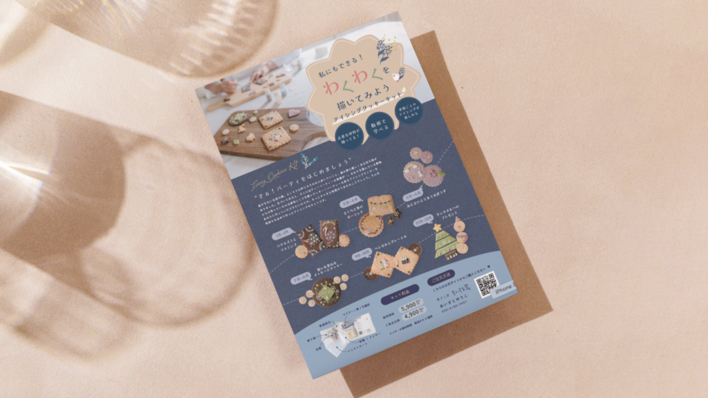 チラシにはQRコードを掲載し、LINEからアイシングのレクチャー動画へアクセスできる導線を設計しました。紙のチラシで商品の魅力を伝えながら、実際の作り方は動画で学べる仕組みにすることで、購入後の体験価値も高めています。デザインとデジタル導線を組み合わせた、今の時代に合った販促ツールとなっています。