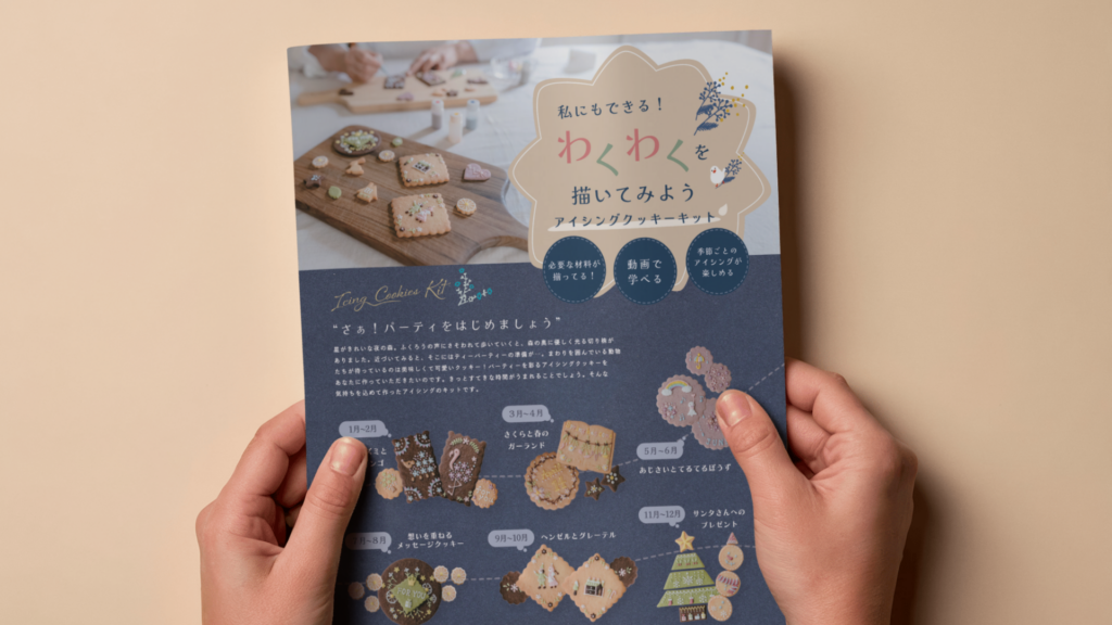 今回のチラシでは、「商品を売る」だけでなく、「体験を届ける」ことをテーマにデザインしました。作る楽しさ、季節のイベント、家族や友人と過ごす時間。そんなアイシングクッキーキットの魅力が伝わるよう、写真、コピー、情報設計を一体として制作しています。