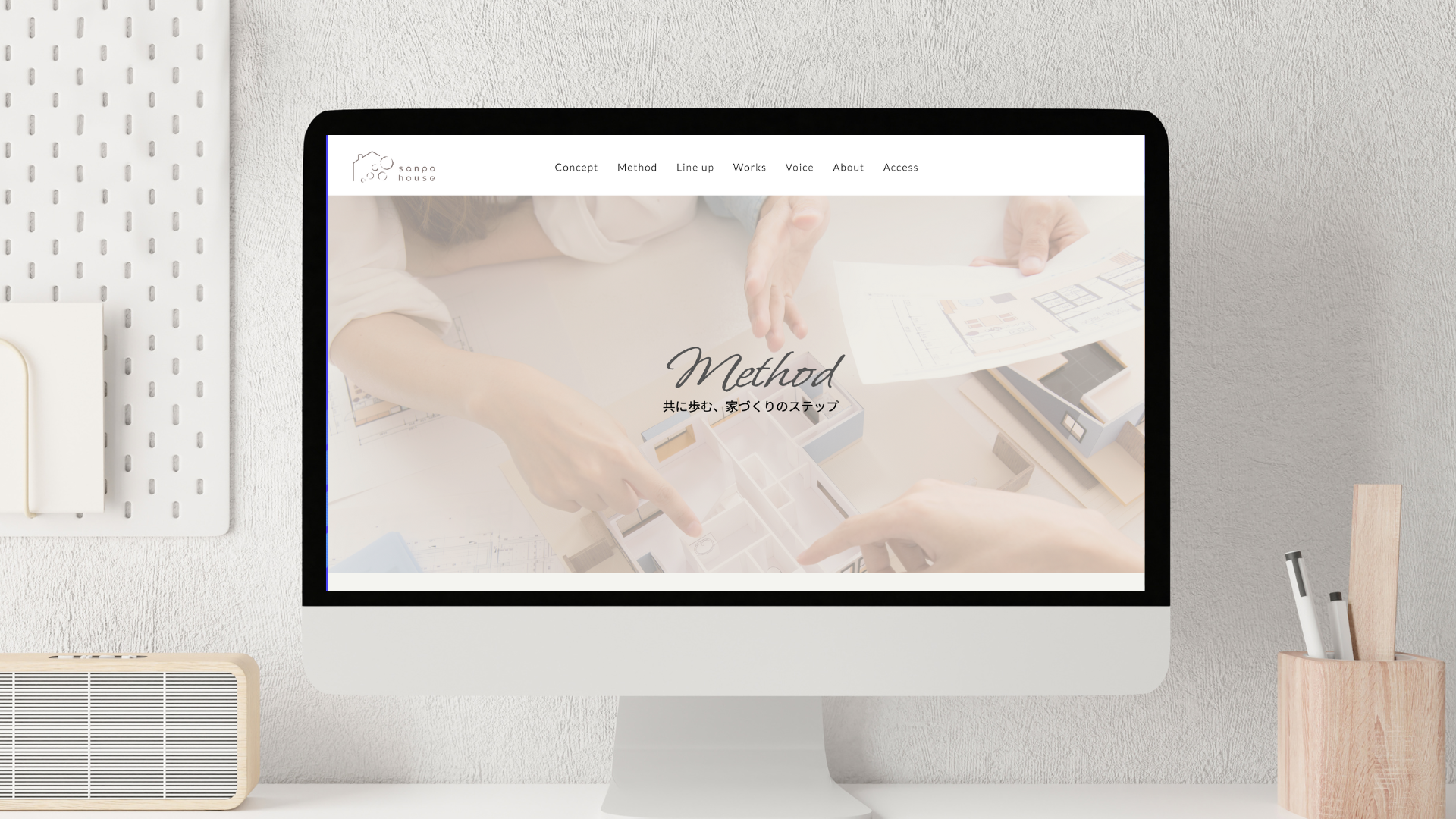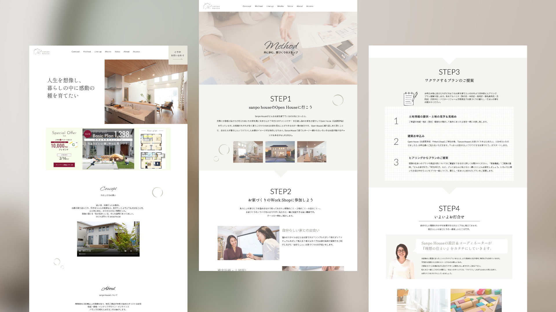 sanpo houseの特徴である「一緒に考える家づくり」を伝えるため、MethodページではSTEP形式で家づくりのプロセスを整理しました。Open HouseからWorkshop、プラン提案、お打ち合わせまでの流れを、言葉とビジュアルで丁寧に可視化することで、初めての方でも不安なくイメージできる構成にしています。