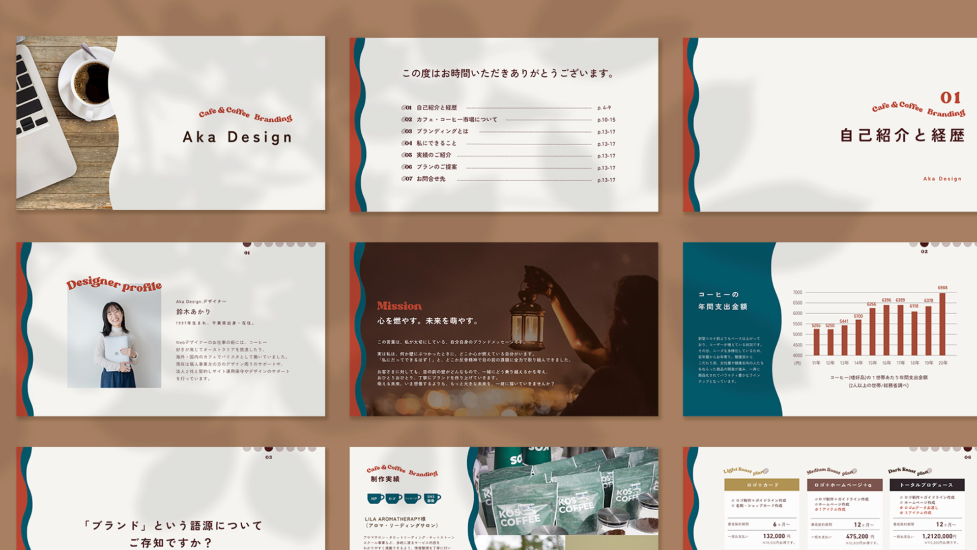 鈴木様は「カフェ・コーヒー専門デザイナー」として活動されているため、その専門性や世界観が伝わるようブランディングもドマノマドで整えました。資料全体のカラーやデザインは、コーヒーの温かみや落ち着きを感じるトーンでまとめ、ターゲットであるカフェやコーヒーブランドの方に響くデザインに仕上げています。