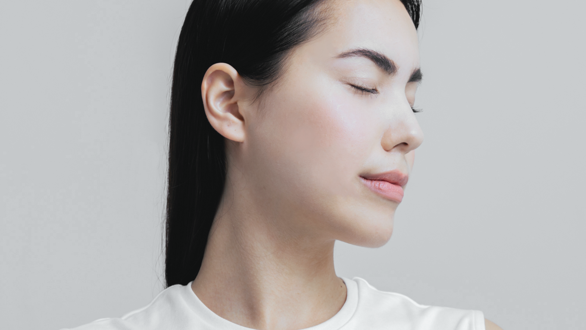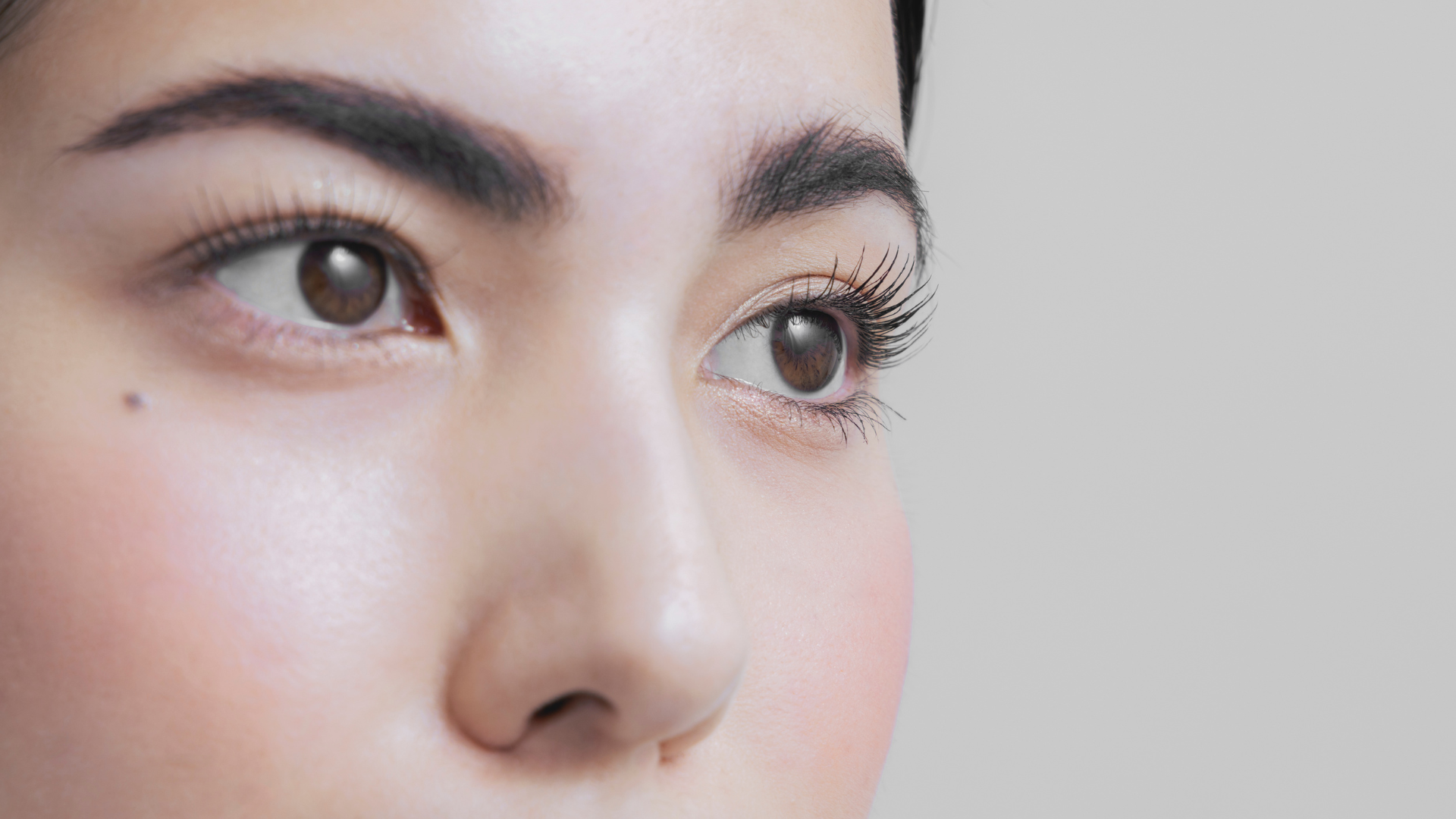 シンプルな背景と光のコントロールによって、モデルの表情やまつ毛の美しさが際立つ写真に仕上げています。